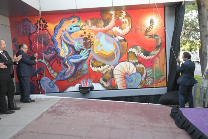 El maestro Luis Rivera Campos, rector de la Universidad Autónoma de Chihuahua, en conjunto con su homólogo de la Universidad de Barcelona, el doctor Joan Guárdia Olmos, develaron el mural titulado “El Brindis” ubicado en la entrada principal del Centro de Idiomas en el Campus I de la UACH