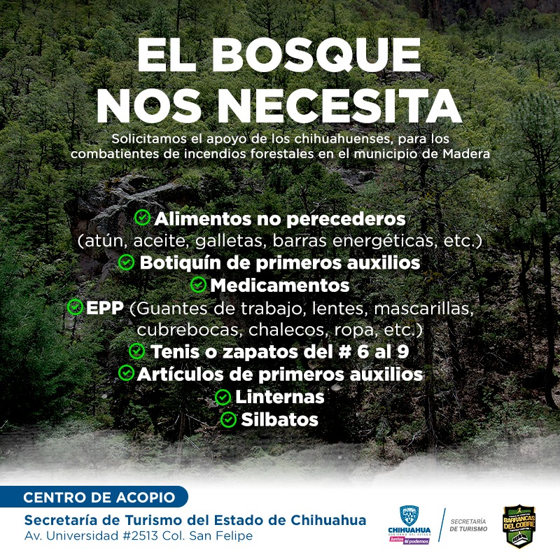 La Secretaría de Turismo y el Parque de Aventura Barrancas del Cobre, instalaron un Centro de Acopio en las oficinas de la dependencia para recolectar insumos que ayuden a los rescatistas, voluntarios y ciudadanos que trabajan en la importante labor de sofocación de incendios forestales que se encuentran activos en el municipio de Madera.