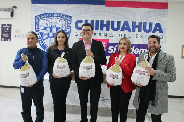 En conjunto con la directora de Grupos Vulnerables, Raquel Jiménez Rodríguez de la Secretaría de Desarrollo Humano y Bien Común, Gómez Gallegos recibió del presidente de INDEX, Román Rivas Hong y representantes del sector industrial, 352 pavos para la cena navideña en diferentes zonas de la entidad.