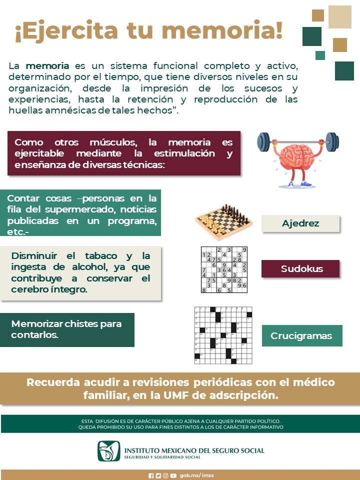El Instituto Mexicano del Seguro Social (IMSS) Chihuahua, a través de la Jefatura de Prestaciones Médicas, destacó que el envejecimiento cerebral puede prevenirse mediante la estimulación de la memoria.