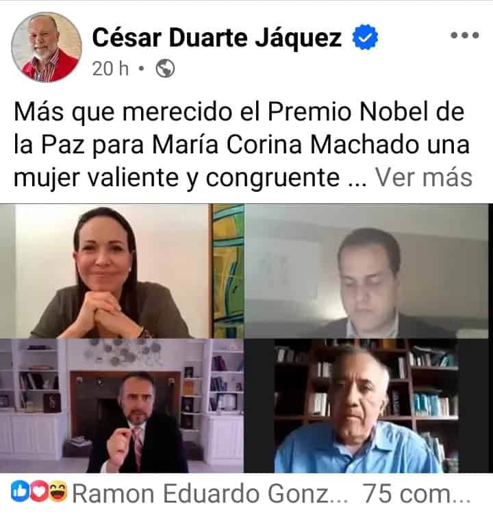 “Más que merecido el Premio Nobel de la Paz para María Corina Machado, una mujer valiente y congruente que no ha dejado de pelear por su causa y por el pueblo venezolano. Quiero compartirles que siento mucho orgullo, pues mi gran amigo Marcelo González Tachiquín es y ha sido su coach desde hace tiempo. Sin duda, un gran orgullo para Chihuahua y una enorme satisfacción para mi querido Marcelo, quien también es mi maestro, formar parte de este equipo. No muchos tenemos el privilegio de compartir docente con un premio Nobel de la Paz”, escribió César.