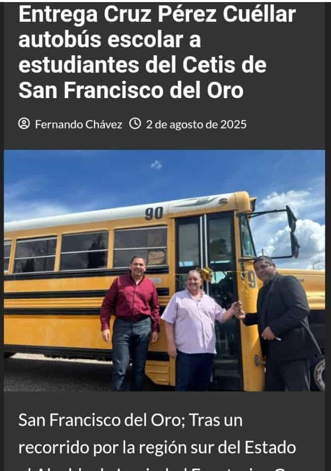 El nuevo “Tío Rico” de Chihuahua, el mote con el que le conocen también los presidentes municipales del estado al alcalde de Ciudad Juárez, Cruz Pérez Cuéllar, apareció el fin de semana en los municipios de San Francisco del Oro y Valle de Allende, además de El Vergel, hasta donde llevó camiones de transporte escolar y mobiliario para las escuelas de la región con los que se estima, ha gastado ya el doble del tope establecidos en una campaña formal como la del 2021.