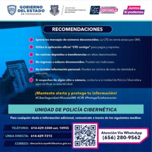 La Secretaría de Seguridad Pública del Estado (SSPE), a través de la Unidad de Policía Cibernética alertó a la población ante un nuevo modelo de fraude digital, que utiliza como gancho un mensaje de texto presuntamente enviado por la Comisión Federal de Electricidad (CFE).