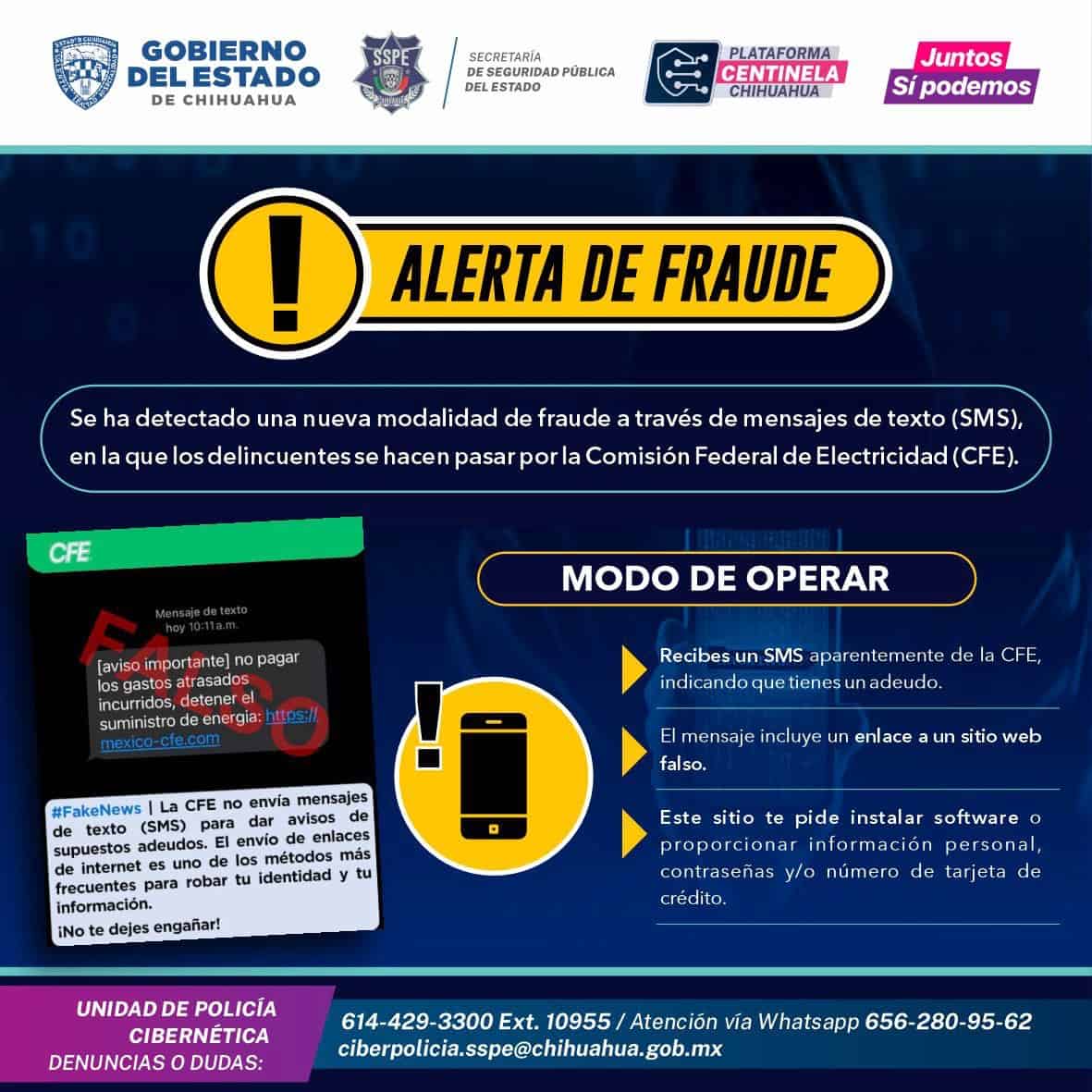 La Secretaría de Seguridad Pública del Estado (SSPE), a través de la Unidad de Policía Cibernética alertó a la población ante un nuevo modelo de fraude digital, que utiliza como gancho un mensaje de texto presuntamente enviado por la Comisión Federal de Electricidad (CFE).