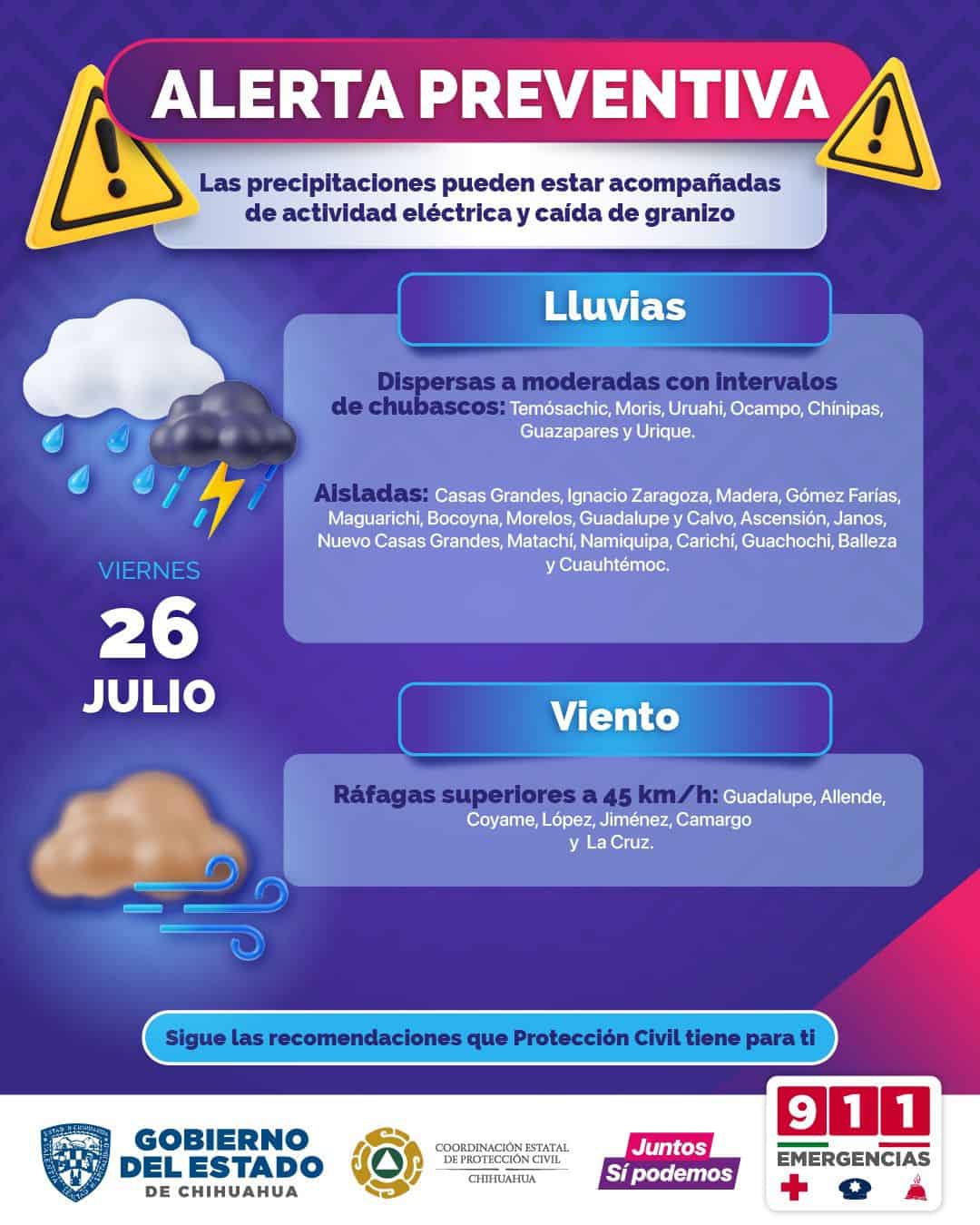 La Coordinación Estatal de Protección Civil (CEPC), emitió una alerta preventiva a la población ante el pronóstico de lluvias puntualmente fuertes para la entidad durante el fin de semana, especialmente en municipios de la Sierra Tarahumara.