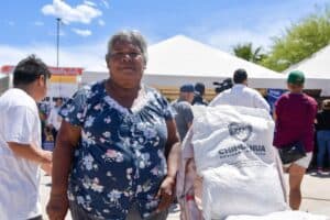 Posteriormente, la mandataria en compañía del secretario de Desarrollo Humano y Bien Común, Rafael Loera, entregó 300 despensas a las familias que acudieron para aprovechar los servicios ofrecidos por las dependencias ahí representadas.