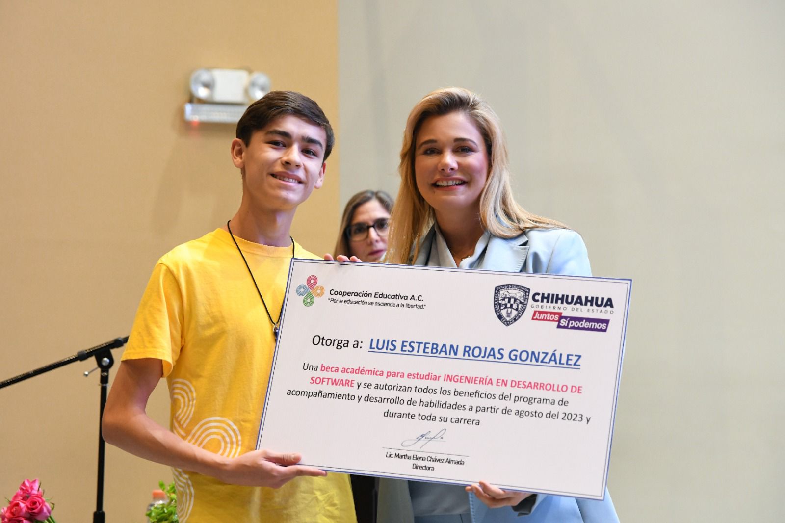 Al hacer uso de la palabra, Alejandro Lara Cruz, presidente del Consejo Directivo de Cooperación Educativa A.C., comentó que estos jóvenes becarios son por quienes se trabaja día con día en la asociación; agradeció la presencia de la Gobernadora Maru Campos así como su cercanía y apoyo a los jóvenes estudiantes del estado, además de su autorización para formar alianzas y otorgar becas de competitividad con la Universidad Tecnológica de Chihuahua y la Universidad Politécnica de Chihuahua.