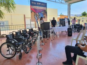 El director de Rehabilitación, Hiram Mendoza Rodríguez, con un grupo de colaboradores acudieron a cada una de las localidades para entregar 292 Sillas de ruedas estándar, 72 andaderas, 163 bastones y 44 juegos de muletas.