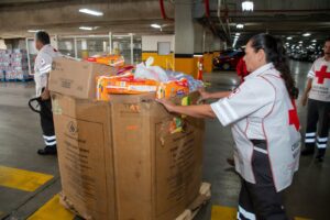 Costales de comida para perro, bolsas de comida para gato, detergentes, rollos de papel higiénico, cajas de pañales para bebé, toallas sanitarias, productos varios de higiene personal, leche, latería variada, comida para bebé, paquetes de galletas, bolsas de sopa variado, café soluble, azúcar, cajas de cereales, botes de cloro, cajas de toallitas húmedas, jugos, despensas en caja, aceite para cocinar, ropa, jabón en polvo, paquetes de tapetes desechables, sopas instantáneas, frijoles en bolsa, botellas de agua, entre otros artículos que serán entregados en las zonas afectadas por la Cruz Roja Mexicana.