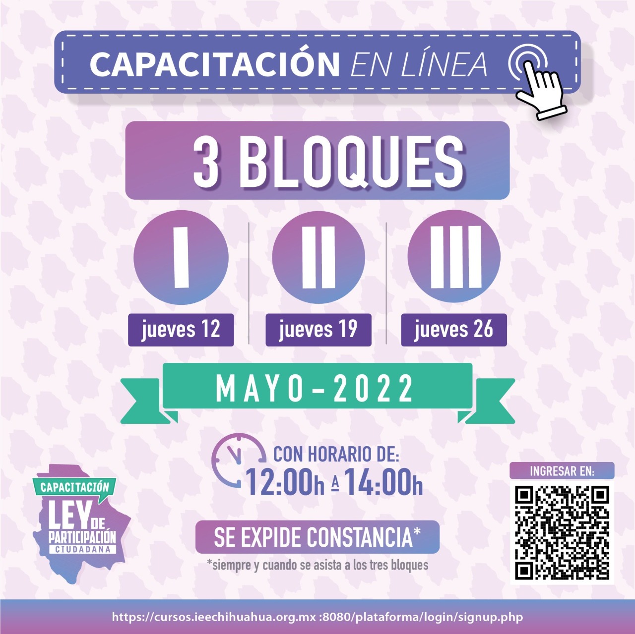 Los cursos están disponibles para todo público, se imparten en lenguaje común para que el contenido sea asimilado por personas no experimentadas en cuestiones legales, electorales o de participación ciudadana; al terminar los tres bloques, las personas asistentes obtendrán una constancia.