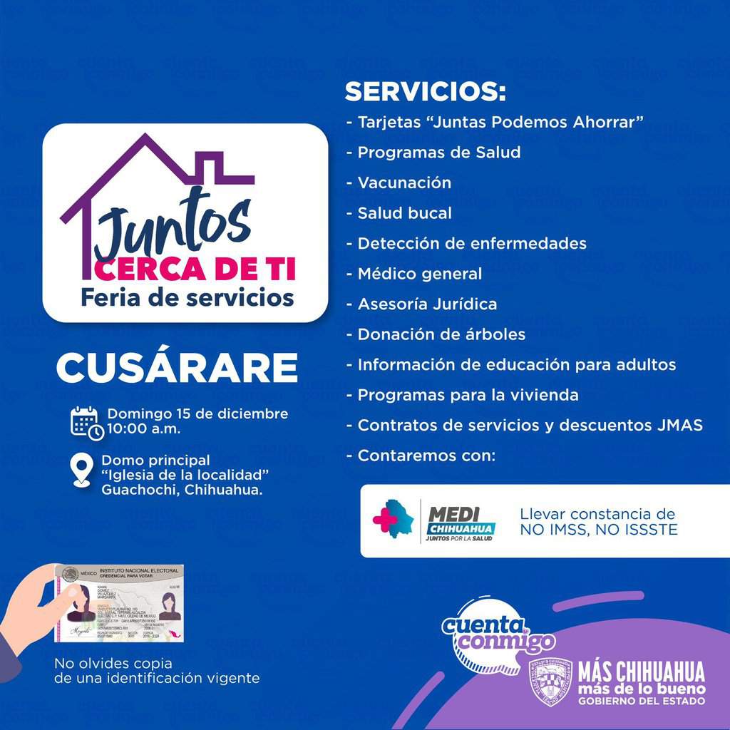 El funcionario detalló que se podrán adquirir tarjetas del programa “Juntas Podemos Ahorrar” del Instituto Chihuahuense de las Mujeres, y se contará servicios de salud como detección de enfermedades dentales, vacunación, médico general, entregan de medicinas y afiliación al programa Medi Chihuahua.