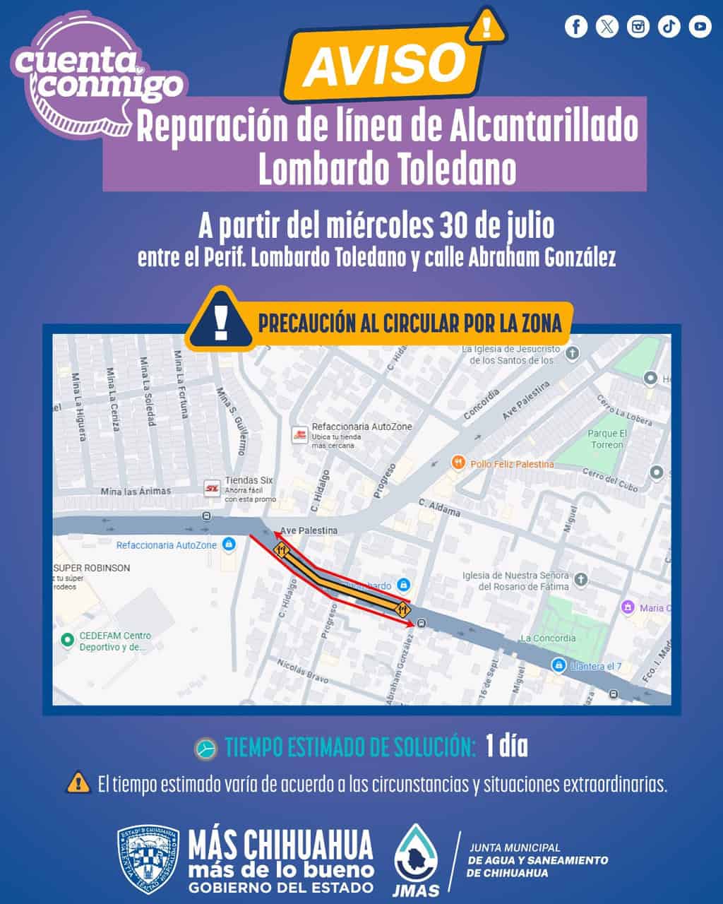La Junta Municipal de Agua y Saneamiento (JMAS) de Chihuahua informó que este miércoles 30 de julio, realizará los trabajos de reparación de un tramo de línea de drenaje dañada en el periférico Lombardo Toledano, entre las calles Hidalgo y Abraham González.