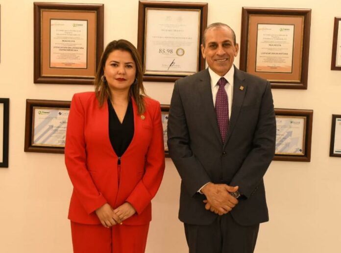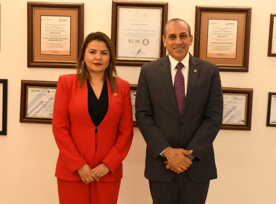 Geo Bujanda, presidenta del Congreso del Estado y el rector de la Universidad Autónoma de Ciudad Juárez, Mtro. Juan Ignacio Camargo Nassar firmaron un convenio de colaboración para que las y los estudiantes puedan prestar su servicio social y prácticas profesionales dentro del Poder Legislativo, además de realizar actividades conjuntas de capacitación, investigación tecnológica y científica.
