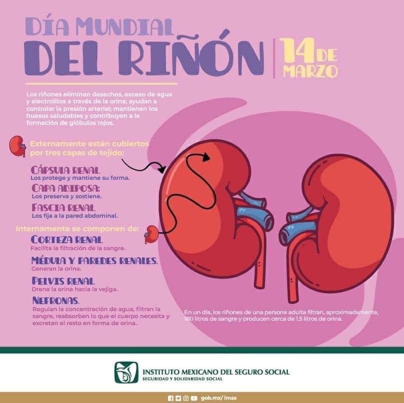 En el marco del Día Mundial del Riñón, el Instituto Mexicano del Seguro Social (IMSS) en Chihuahua, a través de la Coordinación de Salud Pública, emitió una serie de recomendaciones para el adecuado cuidado de los riñones y manteniendo un estilo de vida saludable.