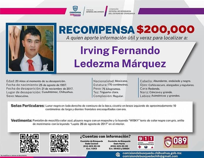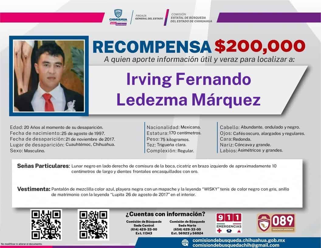La Fiscalía busca información e indicios que pudieran ayudar a encontrarlo, motivo por el cual, se ofrece una recompensa de 200 mil pesos por parte de la Comisión Local de Búsqueda, para quien aporte información sobre su paradero.