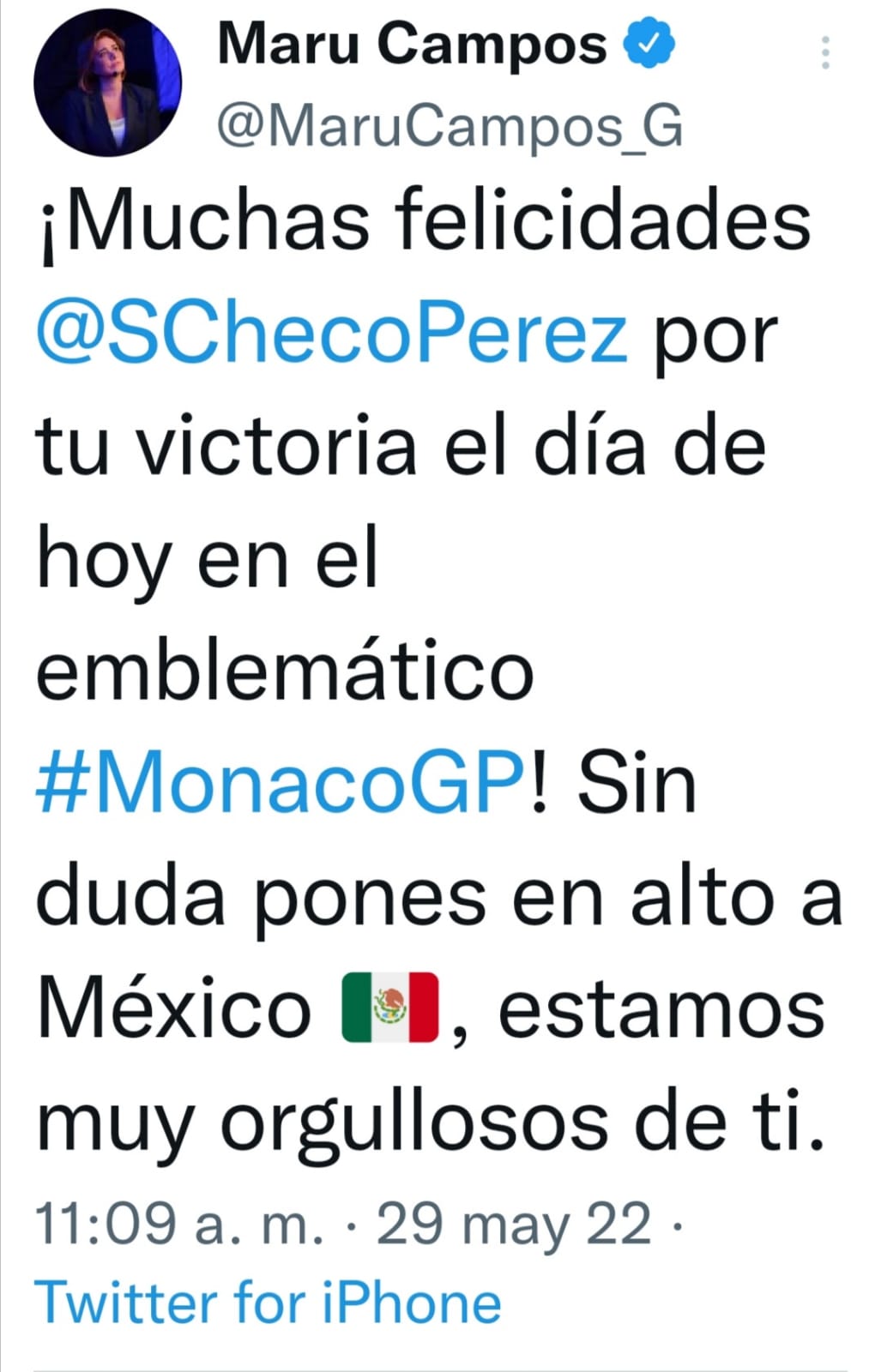 CHIHUAHUAPORTADAFelicita Gobernadora a Checho Pérez por su triunfoPor Contracorriente - mayo 29, 2022FacebookTwitterPinterestWhatsApp Checo se convirtió en el primer mexicano en levantar el trofeo en la cima del podio en Mónaco, circuito reconocido mundialmente por su posicionamiento y relevancia para la Fórmula 1.