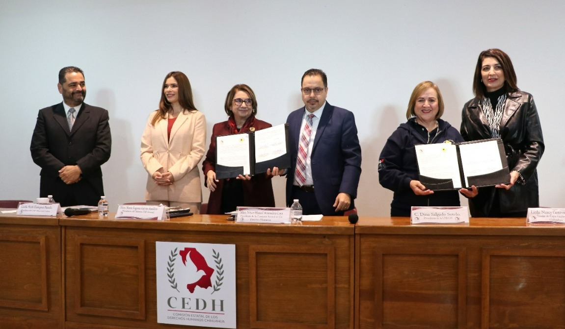 El convenio fue testificado por la titular de Capacitación, promoción y difusión de CEDH, Nancy Gutiérrez Sáenz y las presidentas de los sistemas DIF Estatal y Municipal de Juárez, María Eugenia Galván Antillón y Rubí Enríquez Parada, respectivamente.