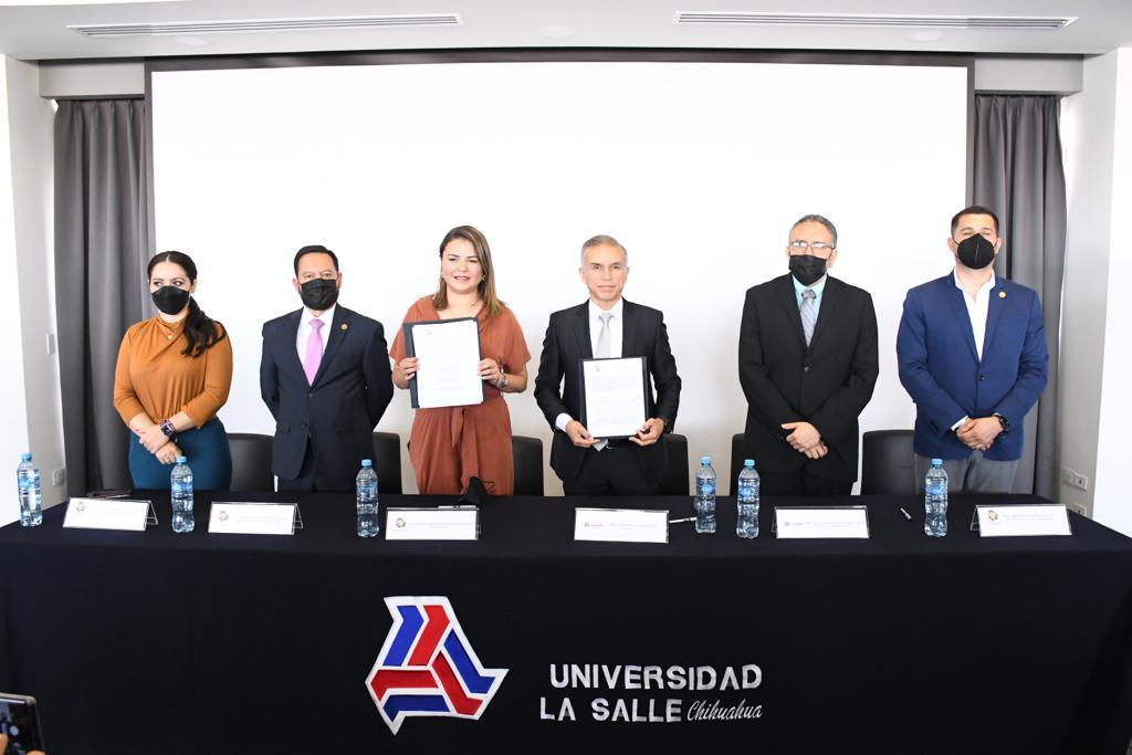 Con la intención de profesionalizar al personal del Congreso del Estado y fortalecer la vinculación con otras instituciones, Geo Bujanda, presidenta del Poder Legislativo signó un convenio de colaboración académica con el rector de la Universidad La Salle Chihuahua, Guillermo García López para que se otorguen becas al personal y/o sus familiares que deseen cursar alguna licenciatura o maestría en la institución.