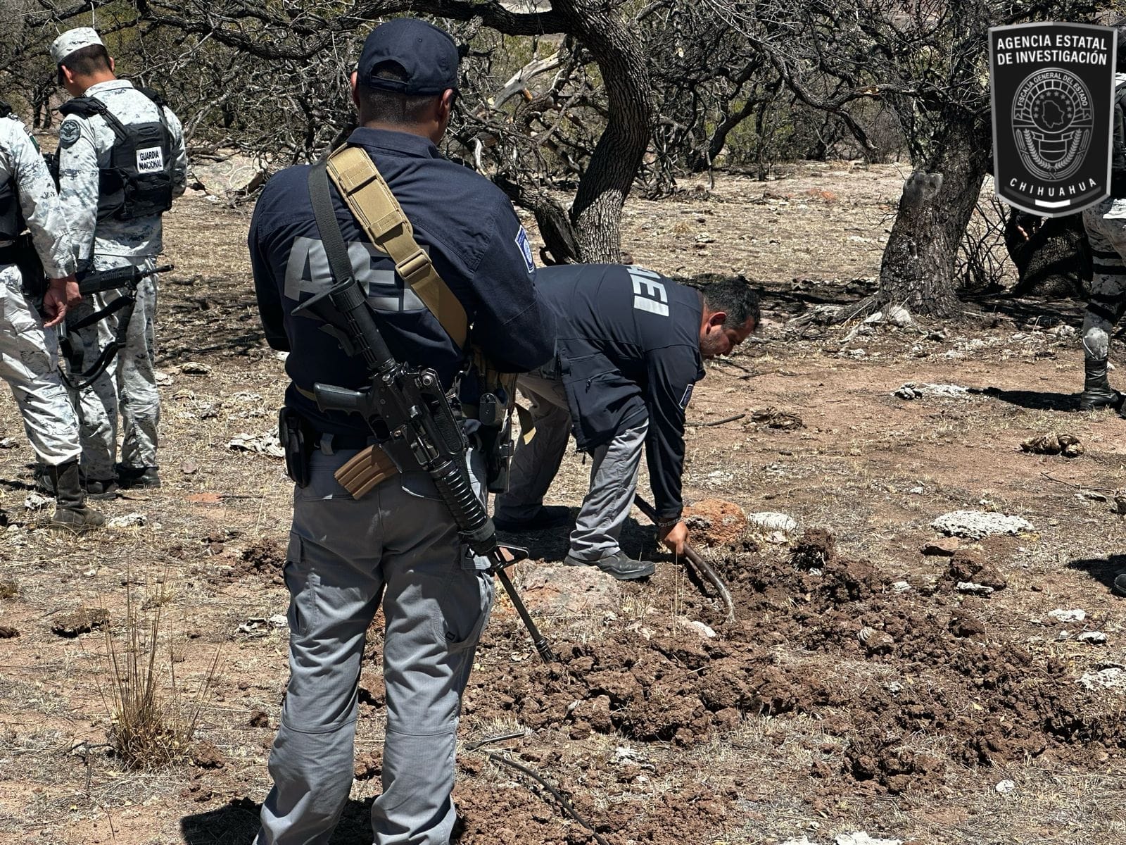 El operativo estuvo encabezado por agentes del Ministerio Público, elementos de la Agencia Estatal de Investigación y peritos en materia criminalística, con el apoyo de elementos de la Secretaría de la Defensa Nacional y de la Guardia Nacional.