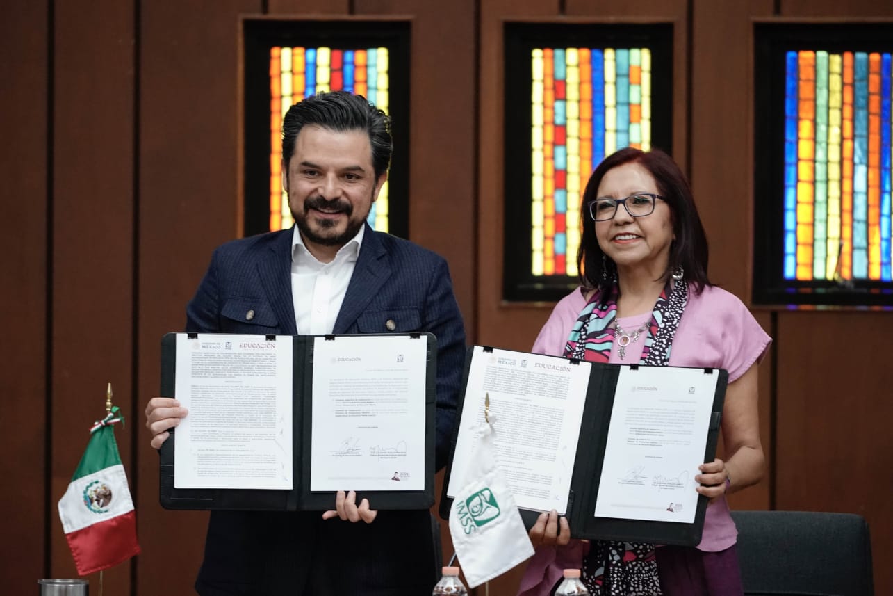 Durante el acto, realizado en la Sala de Banderas de la Conferencia Interamericana de Seguridad Social (CISS), la secretaria de Educación Pública, Leticia Ramírez Amaya, y el director general del IMSS, Zoé Robledo, ratificaron su compromiso en favor de las y los estudiantes.