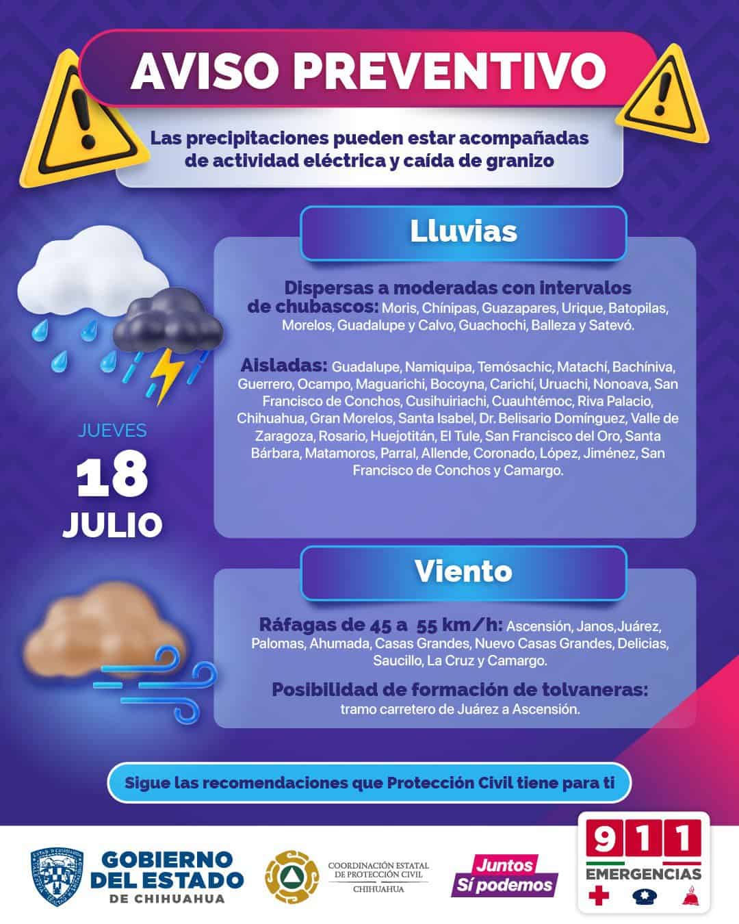 Similares condiciones se esperan en Cuauhtémoc, Riva Palacio, Chihuahua, Gran Morelos, Santa Isabel, Dr. Belisario Domínguez, Valle de Zaragoza, Rosario, Huejotitán, El Tule, San Francisco del Oro, Santa Bárbara, Matamoros, Parral, Allende, Coronado, López, Jiménez y Camargo.