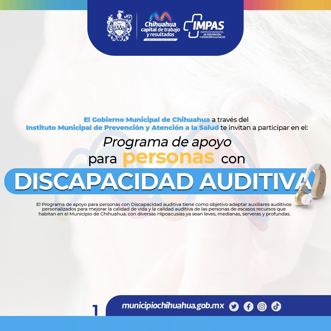 El Instituto Municipal de Prevención y Atención a la Salud (IMPAS) invita a la ciudadanía a inscribirse en la convocatoria del programa “Apoyo para Personas con Discapacidad Auditiva”, en el cual se hará entrega de aparatos auditivos. La convocatoria va estar hasta el 3 de junio.