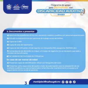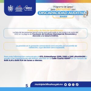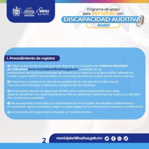 Para participar es necesario llevar impresa y contestada la convocatoria, o solicitarla en las instalaciones del IMPAS, en calle Cuarta, número 2007, de 8:00 am a 8:00 pm de lunes a viernes, hasta el día 3 de junio de 2022; asimismo, dicho formato está disponible en la página oficial del Gobierno Municipal de Chihuahua: http://www.municipiochihuahua.gob.mx/CCS/Convocatorias/Convocatoria_al_Programa_de_apoyo_para_personas_con_Discapacidad_Auditiva_2022.