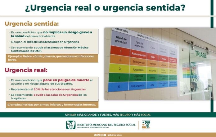 El Instituto Mexicano del Seguro Social (IMSS) en Chihuahua, a través de la Jefatura de Servicios Médicos, da a conocer qué es una urgencia real y una sentida, a fin de que la derechohabiencia haga uso correcto de los servicios de urgencias de las unidades médicas y hospitalarias, para brindar atención adecuada y oportuna, de acuerdo a su requerimiento médico.