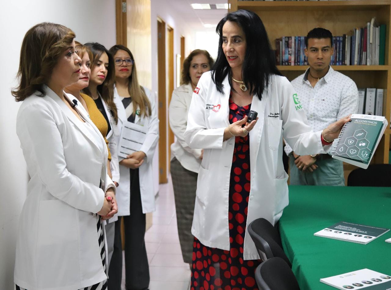 Durante un recorrido por la Coordinación de Innovación en Salud, la directora de Prestaciones Médicas del IMSS, doctora Célida Duque Molina, indicó que estos protocolos están enfocados en la detección temprana, educación y corresponsabilidad en salud individual y colectiva, la ampliación de opciones de fármacos desde el Primer Nivel, intensificación del tratamiento no farmacológico y la opción de terapias dobles y triples en una sola píldora.