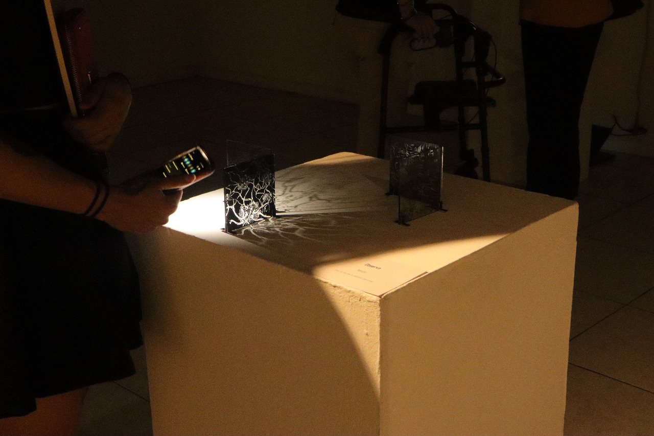 “In Vivo” es una muestra multidisciplinaria conformada por piezas poco usuales como “Descubre”, una instalación compuesta por 10 lupas intervenidas, que el espectador activa por medio del flash de su celular o la pieza que titulada “Observa” que está creada con 10 vidrios de 10×10 centímetros.