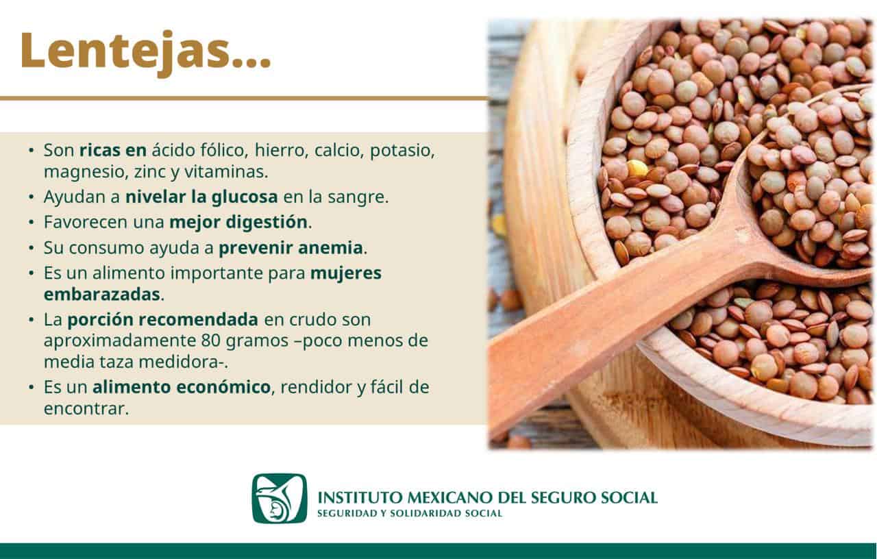 El Instituto Mexicano del Seguro Social (IMSS) en Chihuahua recomienda a la población consumir lentejas, ya que es un alimento con alta concentración de nutrientes, son excelente fuente de proteínas de origen vegetal, bajas en sodio y no contienen colesterol.