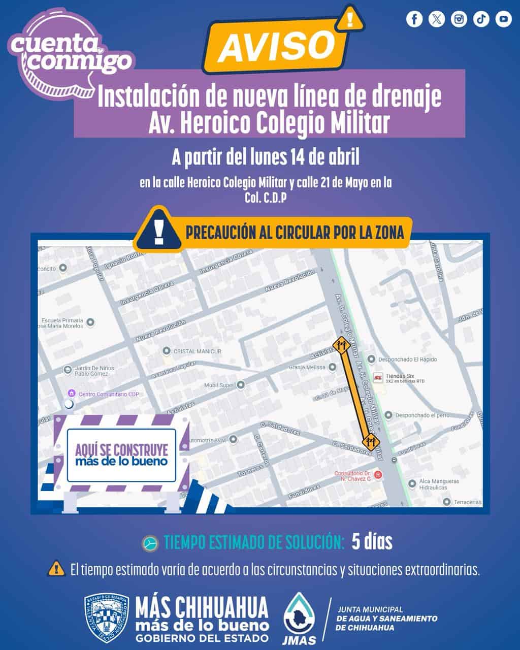 La Junta Municipal de Agua y Saneamiento (JMAS) de Chihuahua informó que este lunes 14 de abril, comenzarán los trabajos de instalación de 116 metros de tubería de drenaje en la avenida Heroico Colegio Militar y calle 21 de Mayo, en la colonia CDP.