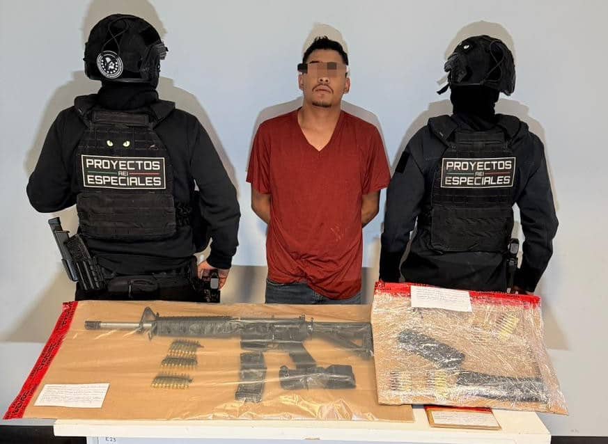 Al momento de su detención, le encontraron un arma larga de color negro con un cargador de plástico, abastecido con 28 cartuchos útiles, un teléfono celular en color rosa, un chaleco táctico pincelado color verde y dos cargadores de plástico color negro, con 18 cartuchos útiles cada uno.