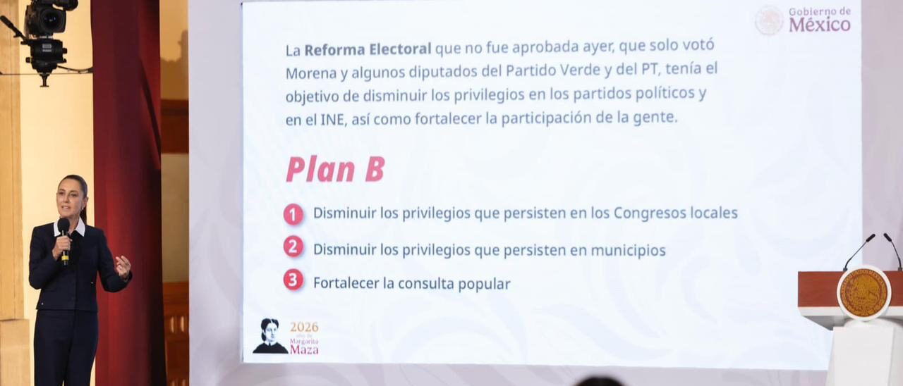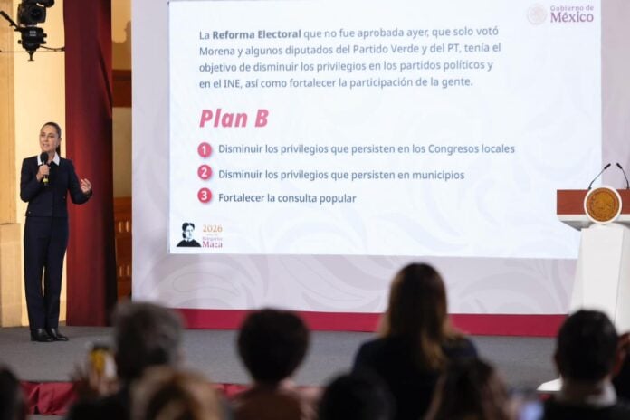 Ciudad de México, 12 de marzo de 2026.- La Presidenta de México, Claudia Sheinbaum Pardo, informó que el próximo lunes 16 de marzo enviará el Plan B de la iniciativa de Reforma electoral que consiste en disminuir los privilegios en Congresos locales y en municipios, al destinar un tope máximo de los recursos que se les destinan, así como fortalecer la consulta popular.