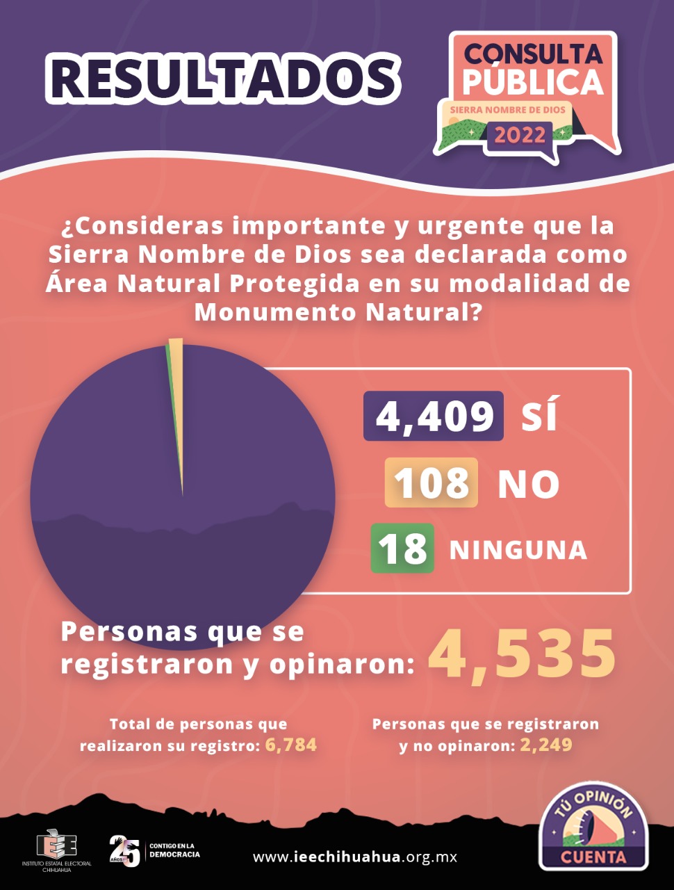 El informe presentado por la Dirección Ejecutiva de Educación Cívica y Participación Ciudadana del Instituto Estatal Electoral de Chihuahua (IEE) ante el Consejo Estatal, relativo a la Consulta Pública Sierra Nombre de Dios, mostró los datos estadísticos de las personas que emitieron opinión en este mecanismo de participación social.