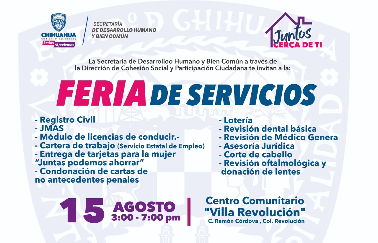 La Secretaría de Desarrollo Humano y Bien Común (SDHyBC) informó que este próximo lunes 15 de agosto arrancará la feria de servicios “Juntos Cerca de Ti” en el Centro Comunitario Villa Revolución, ubicado en calles Ramón Córdova y María Elena Hernández, colonia Revolución, en un horario de 15:00 a 19:00 horas.
