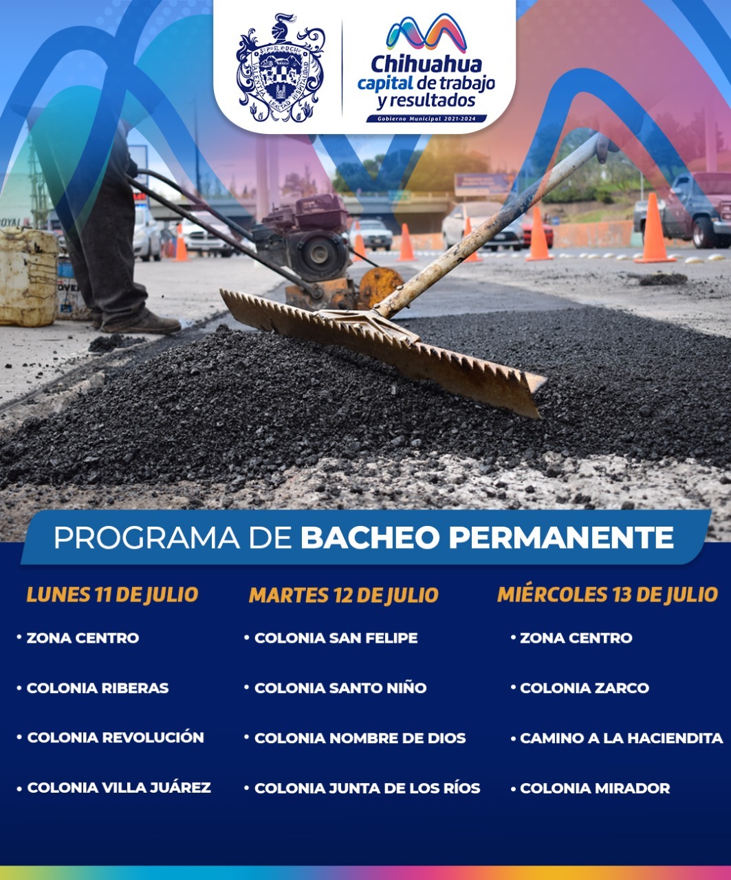 La Dirección de Obras Públicas, pide tomar precauciones a los conductores por los trabajos de bacheo que se realizarán los próximos tres días, a partir de hoy 11 de julio, en diferentes avenidas, calles y colonias de la ciudad, a fin de evitar contratiempos.