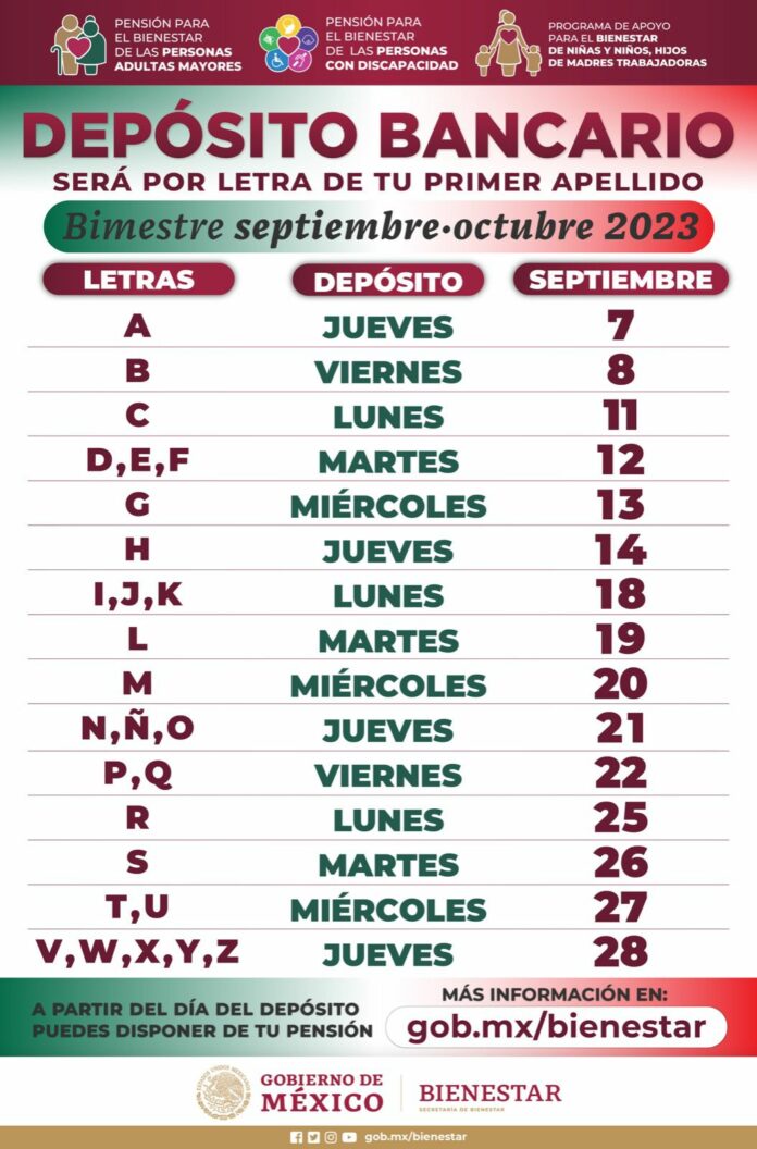Explicó que para el bimestre septiembre-octubre, derechohabientes y beneficiarios recibirán su pensión o programa a través de depósito bancario del 7 al 28 de septiembre.