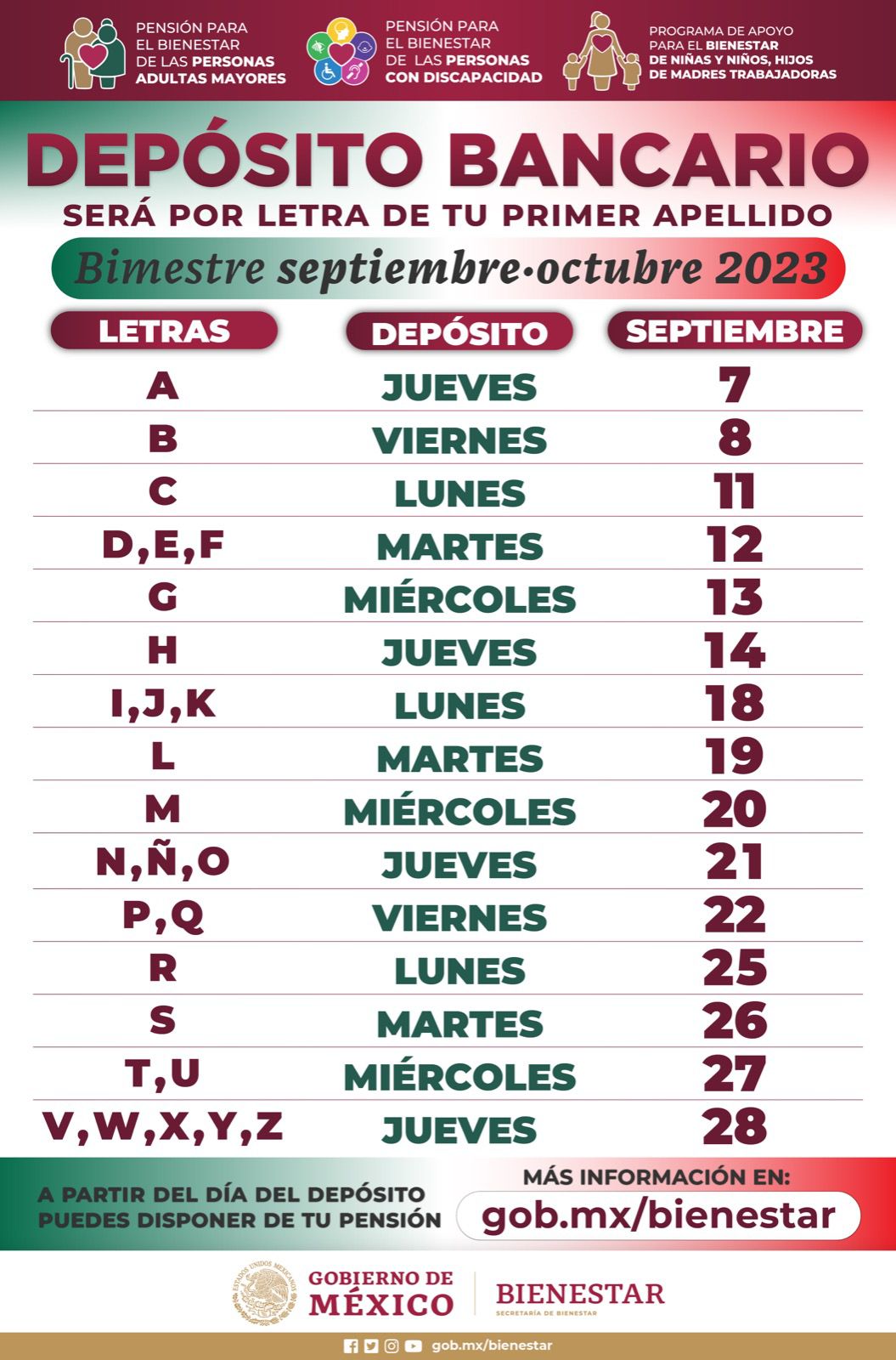 Añadió que, para brindar mejor atención a derechohabientes, el depósito bancario se realizará de acuerdo con la letra del primer apellido, por lo que no es necesario acudir antes de la fecha programada, ya que el recurso estará disponible a partir del día señalado en el calendario adjunto.