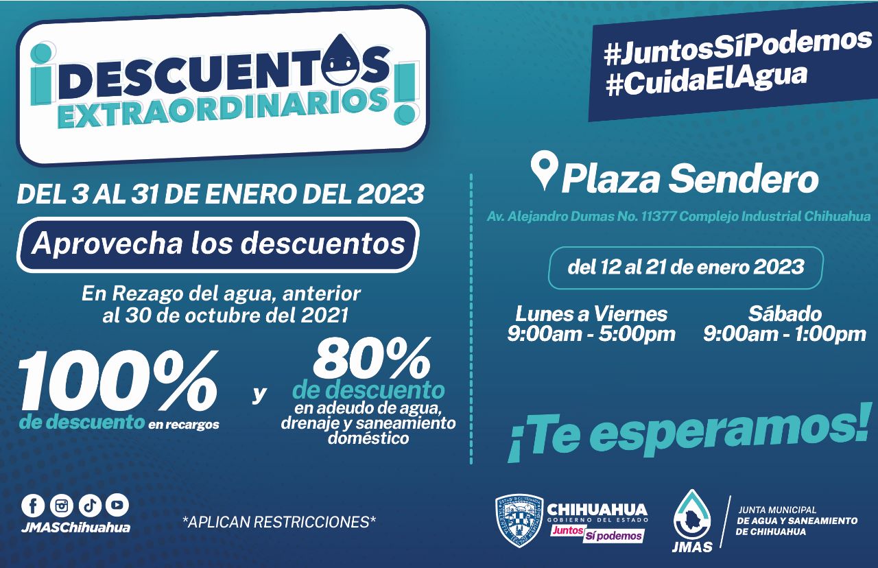 La Junta Municipal de Agua y Saneamiento (JMAS) de Chihuahua anunció que instalará una sucursal móvil en el estacionamiento de Plaza Sendero, ubicada al norte de la ciudad junto al Complejo Industrial Chihuahua, a partir del día de mañana jueves 12 y hasta el 21 de enero.