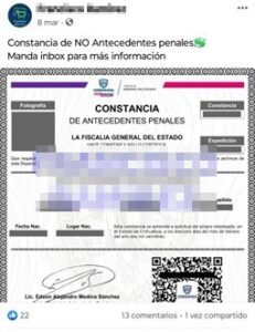 Agentes del Ministerio Público y elementos de la Agencia Estatal de Investigación adscritos a la Unidad de Delitos contra la Paz, investigan ocho casos recientes en los que las personas involucradas adquirieron ese tipo de documentos falsos a través de un perfil de Facebook identificado como “Francisco Ramírez”.