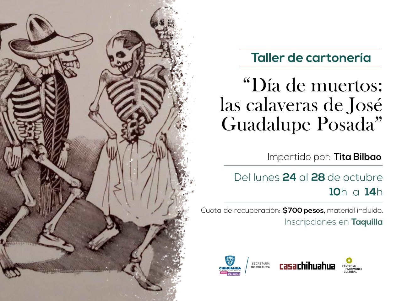 Casa Chihuahua Centro de Patrimonio Cultural invita al público en general a inscribirse en el taller de cartonería “Día de muertos. Las calaveras de José Guadalupe Posada”, que será impartido por la artista Tita Bilbao.
