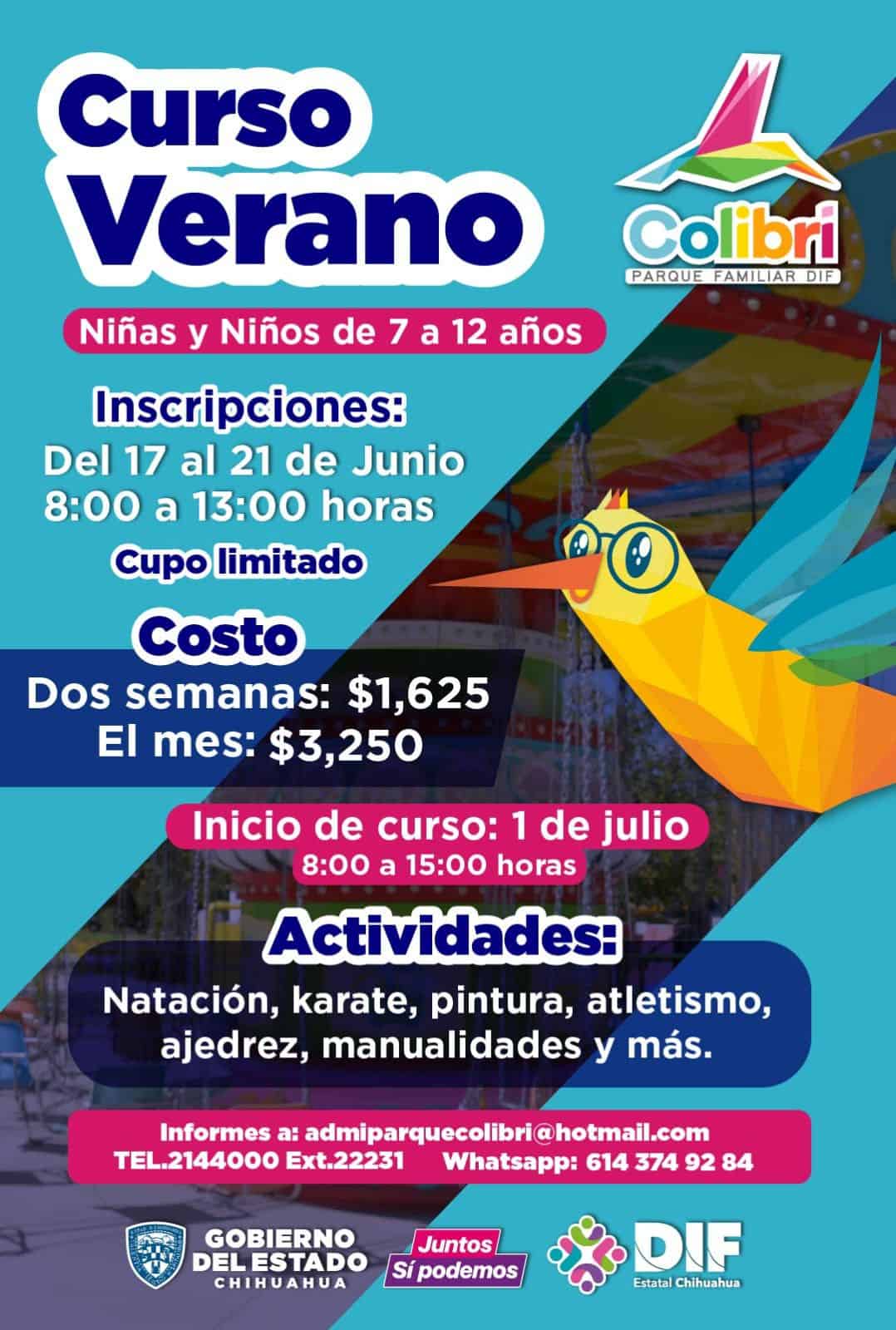 La dirección de esparcimiento del DIF Estatal invita a niñas y niños de 7 a 12 años de edad a los cursos de verano en el “Parque El Colibrí”.