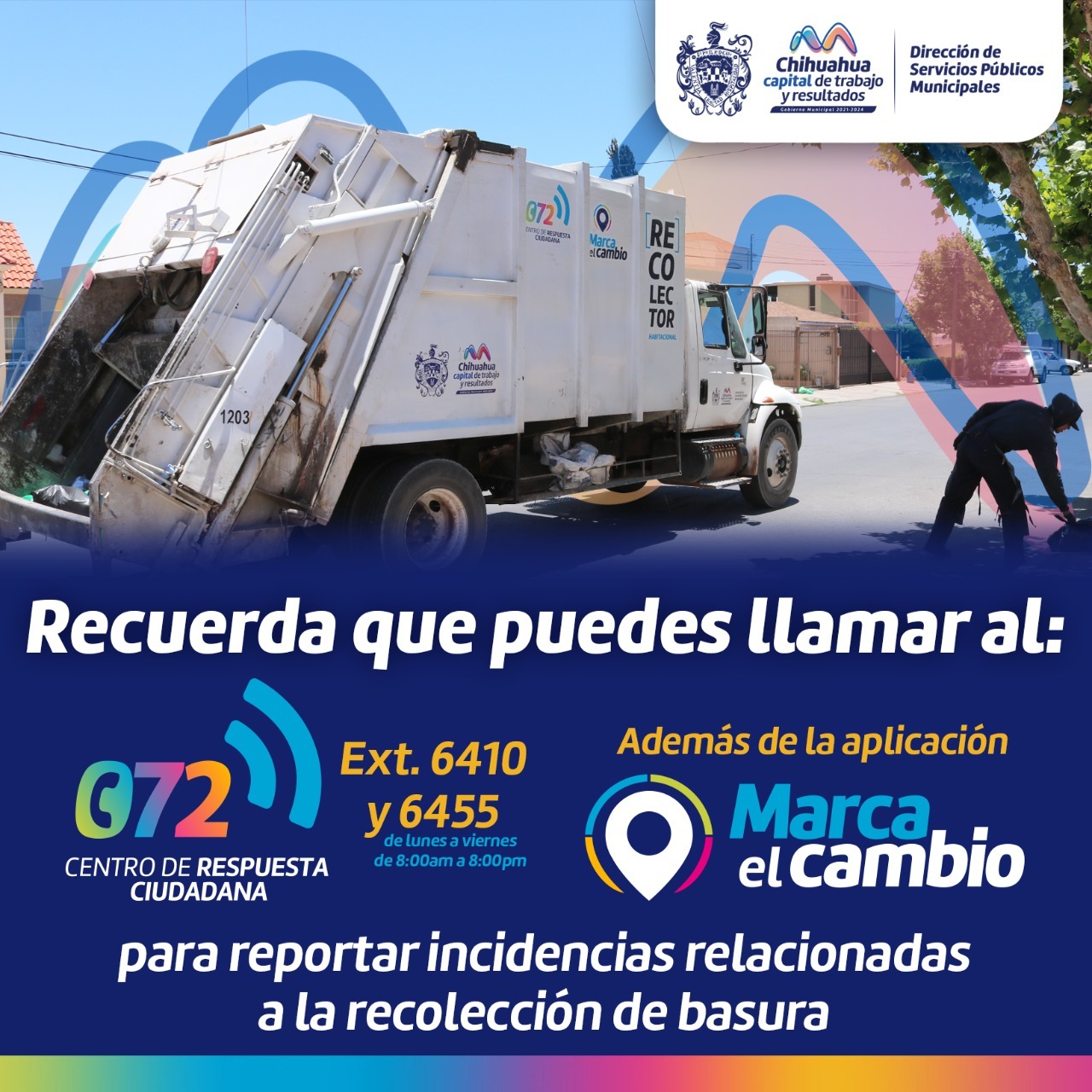 La Dirección de Servicios Públicos Municipales invita a la población a realizar reportes con respecto a este servicio a través del 072 y/o la aplicación Marca el Cambio, con el propósito de mejorar el servicio de recolección de residuos habitacionales.