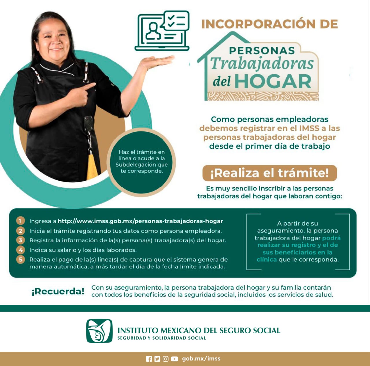 El minisitio www.imss.gob.mx/personas-trabajadoras-hogar permite a los empleadores cumplir con su obligación de registrar a las personas trabajadoras del hogar ante el Instituto de manera sencilla y en cuestión de minutos. Además, ofrece un gran volumen de información al respecto y un simulador de cuotas que permite a empleadores calcular montos a pagar y generar líneas de captura.
