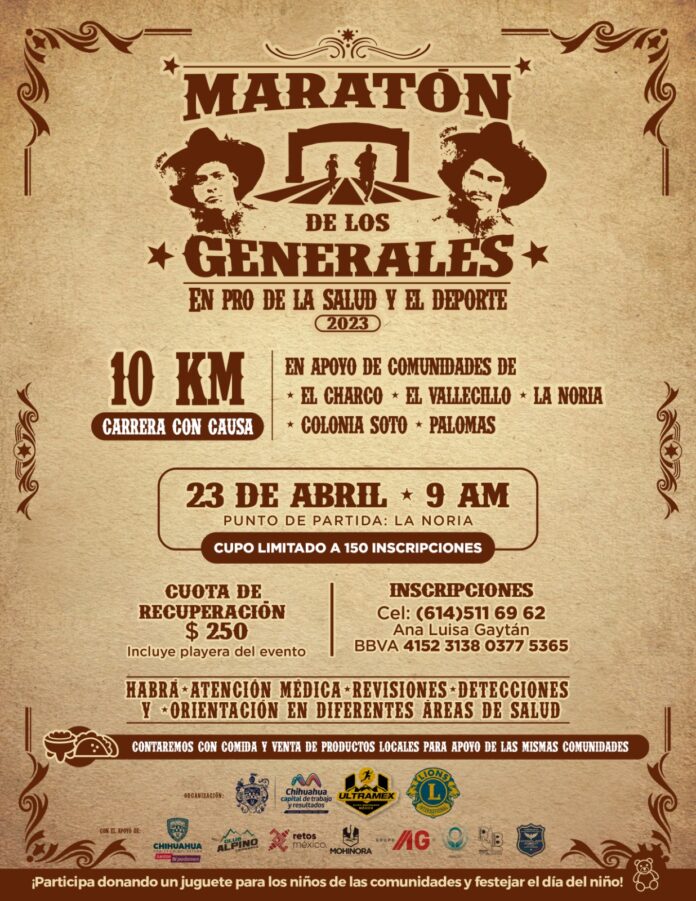 El gobierno municipal invita a participar en el “Maratón Los Generales”, el próximo domingo 23 de abril a las 9:00 am. Esta carrera es de 10 kilómetros y beneficiará a las comunidades de El Charco, El Vallecillo, La Noria, Colonia Soto y Palomas.