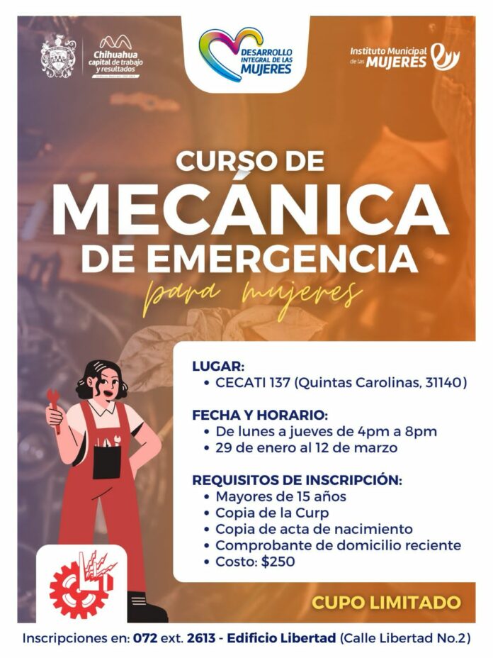 El Instituto Municipal de las Mujeres (IMM) y del Departamento Desarrollo Integral de la Mujer (DIM), invita a las mujeres de Chihuahua a capacitarse en el curso de mecánica de emergencias.