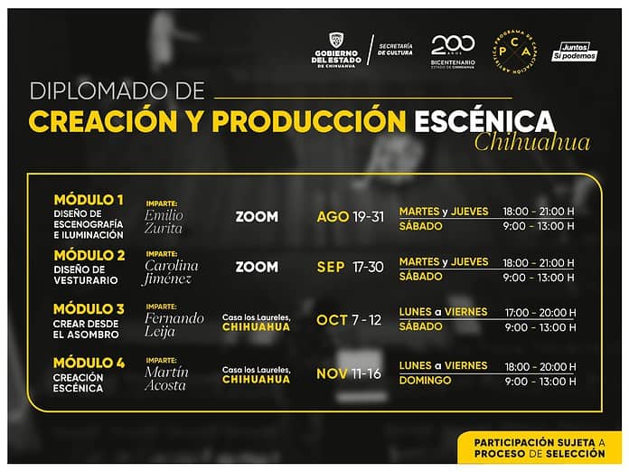 Con el objetivo de fortalecer y crear espacios de intercambio en la comunidad artística, la Secretaría de Cultura, a través del Programa de Capacitación Artística (PCA), invita a sumarse al Diplomado de Creación y Producción Escénica en Chihuahua.