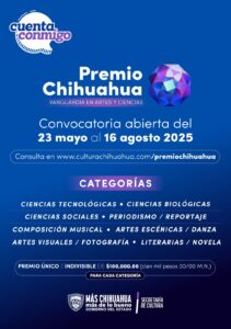 La Secretaría de Cultura reiteró a la ciudadanía, la invitación para participar en la convocatoria del Premio Chihuahua, Vanguardia en Artes y Ciencias 2025.