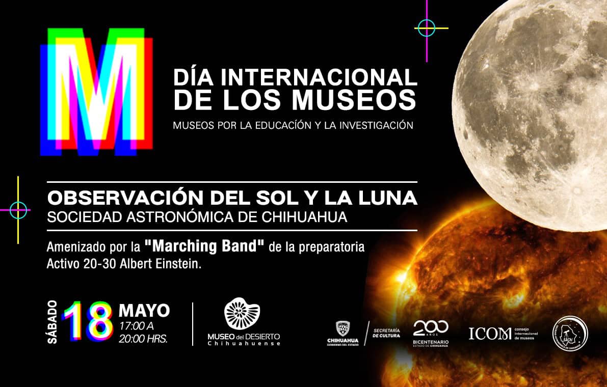 El sábado 18 se realizará una observación astronómica a cargo de la Sociedad Astronómica de Chihuahua (SACh), con avistamientos del sol y la luna a través de telescopios; además se contará con un concierto a cargo de la agrupación musical “Marching Band” de la preparatoria Activo 20-30 Albert Einstein.